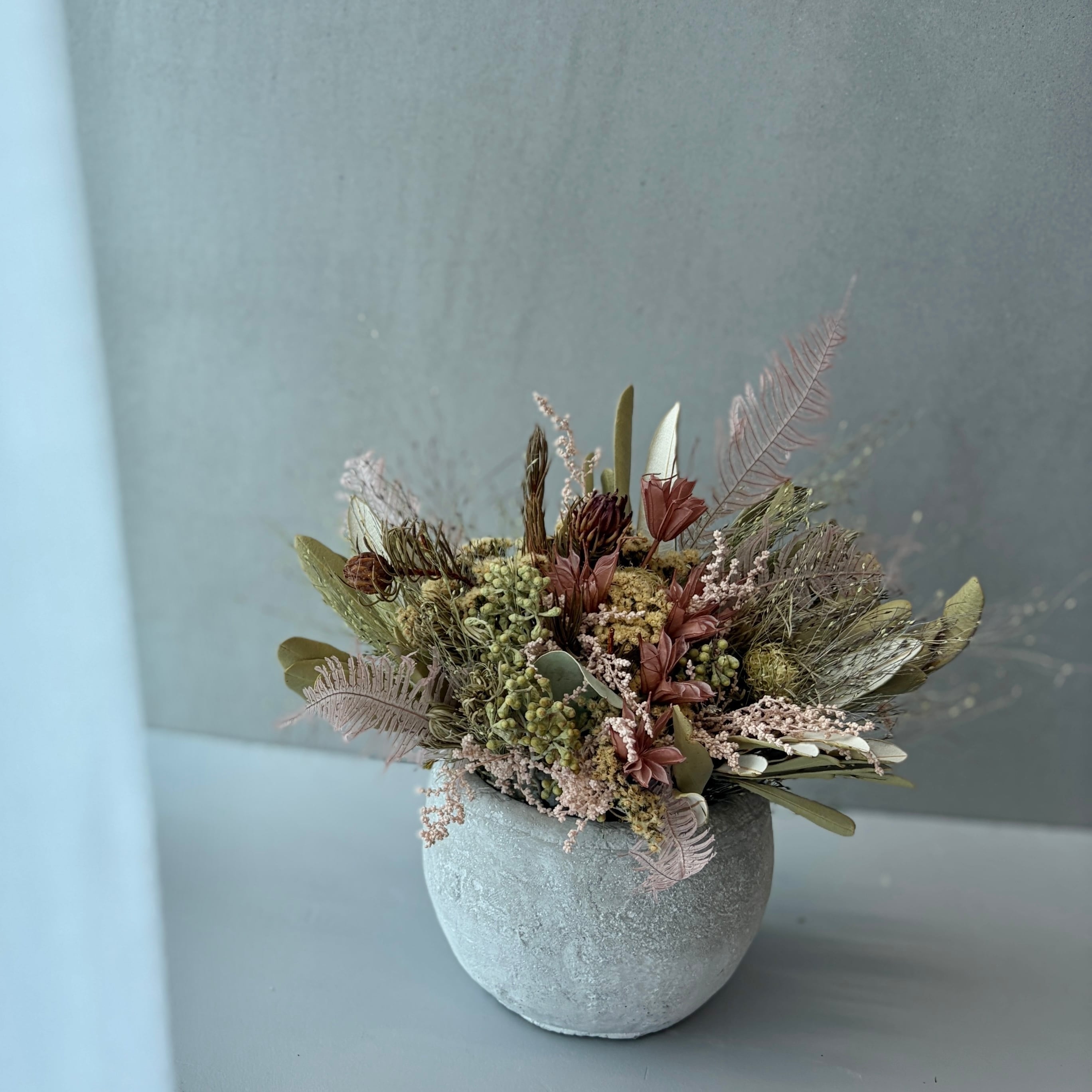 ドライフラワーならではのアンティークなピンクの色合いは、可愛くなりすぎず、優しい華やかさを演出します。