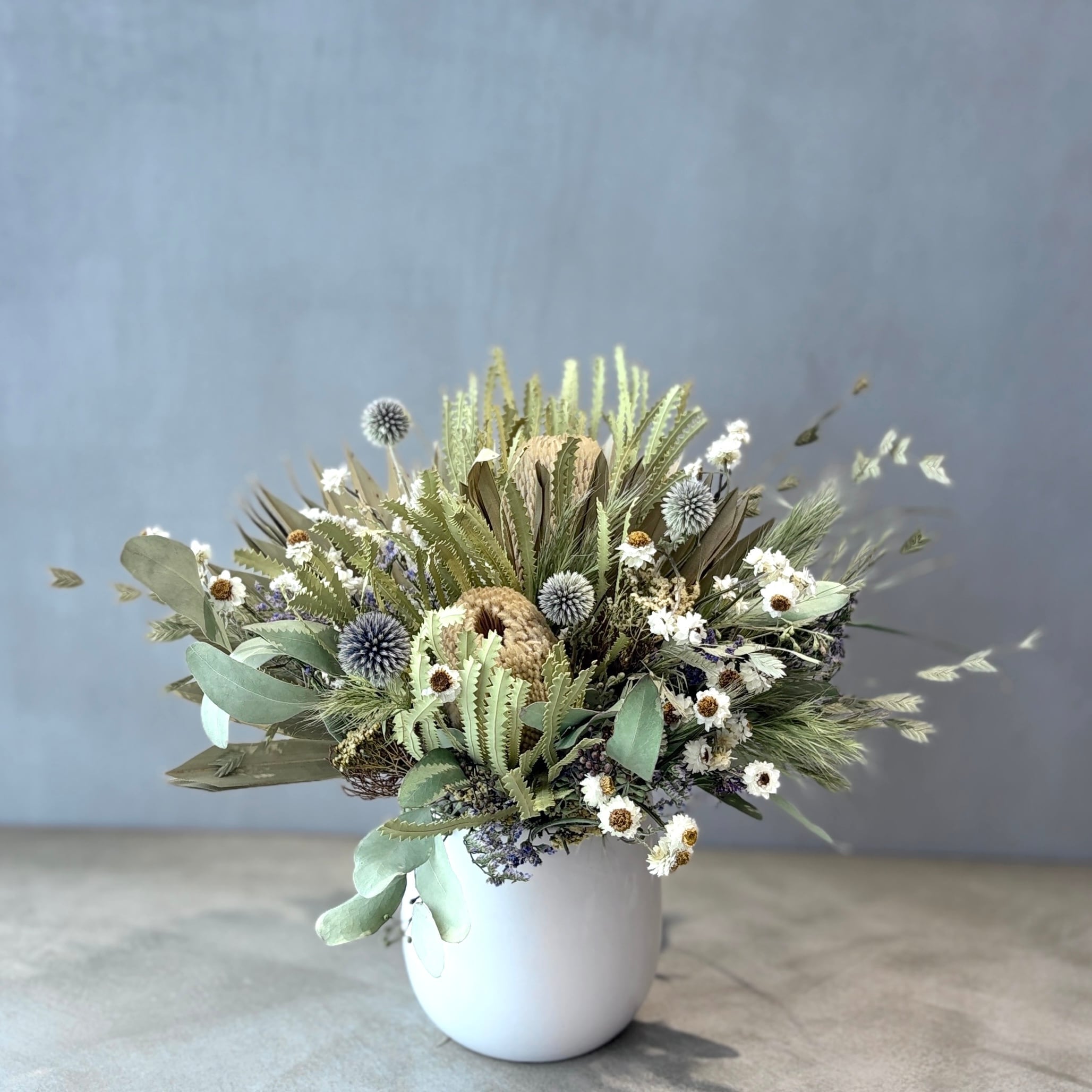 バンクシアや瑠璃玉アザミ、パームフラワーなど個性豊かな花々をワイルドオーツやアンモビューム等のやさしい草花でまとめました。