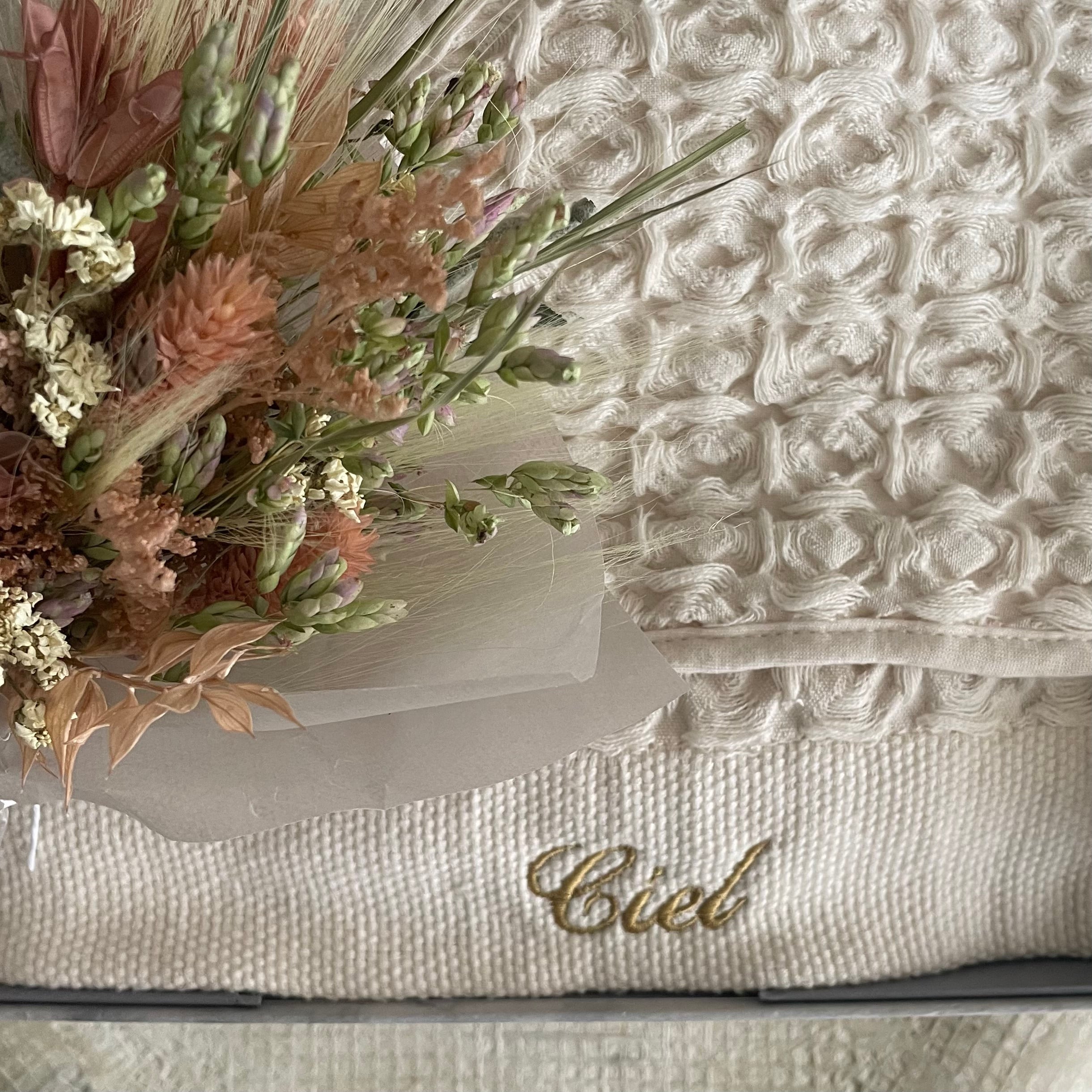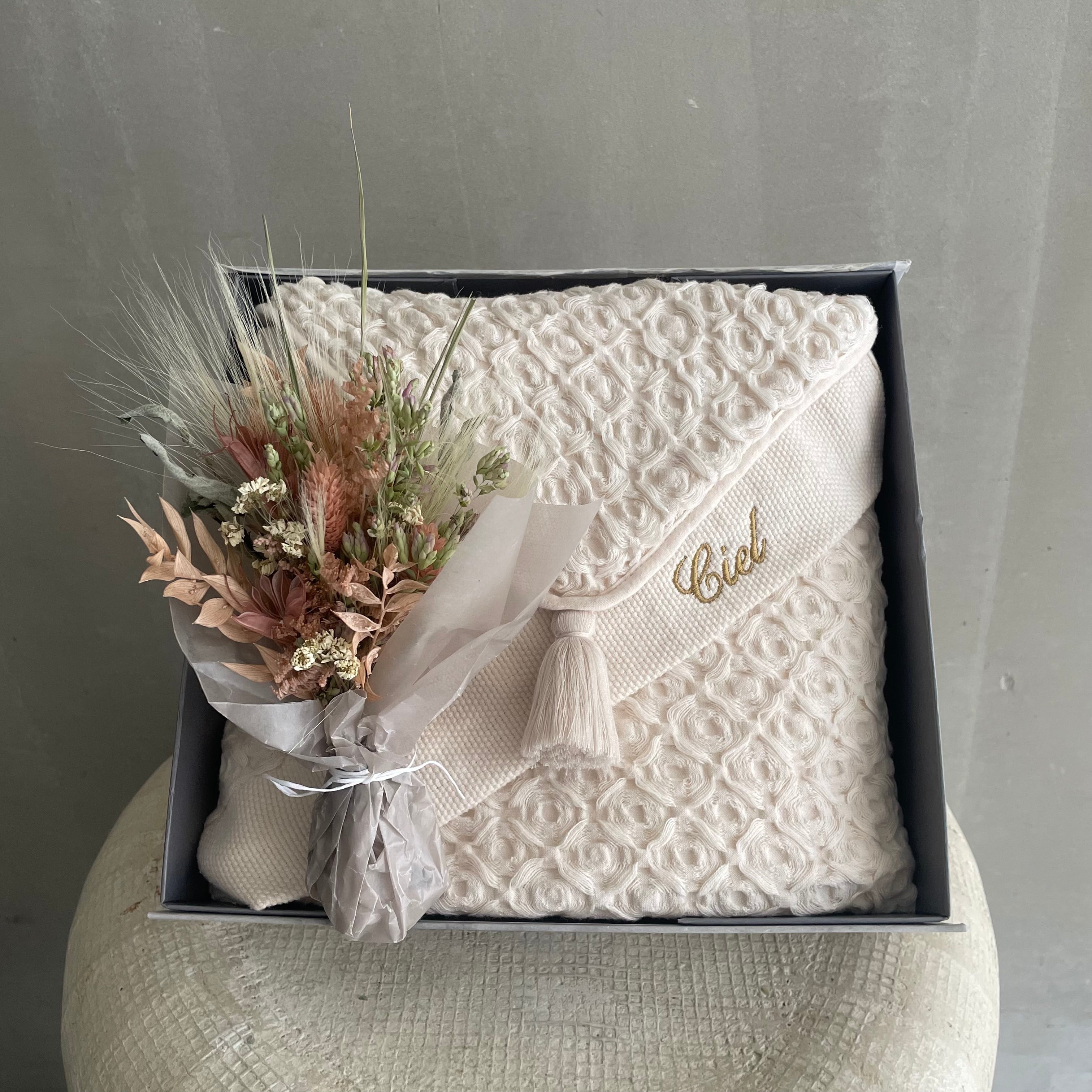こちらは、ドライの花束とMARLMARLの定番アイテムhooded towel のセットボックス。