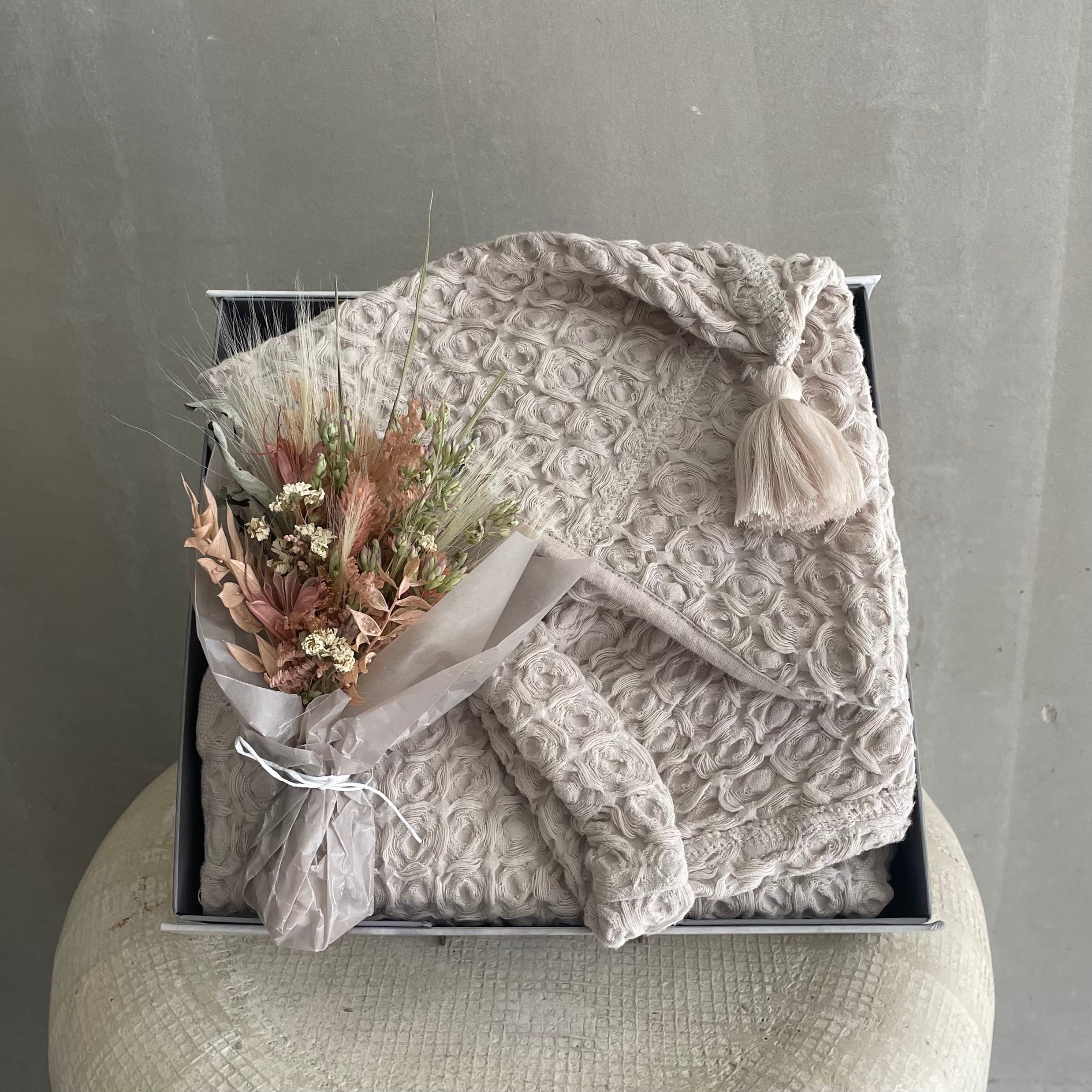 こちらは、ドライの花束とMARLMARLのバスローブのセットボックス。